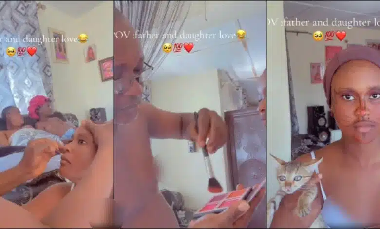 “My own papa wan use advice kee me” – Lady stirs jealousy over bond with her father as he does her makeup