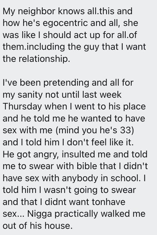 “So there is this guy my parents are forcing me to marry and deep down in their hearts they know I don’t like him (I liked him initially, but I couldn’t cope with his insults and ego), but because prophets says he’s food, I must marry him or get ready to leave their house…”