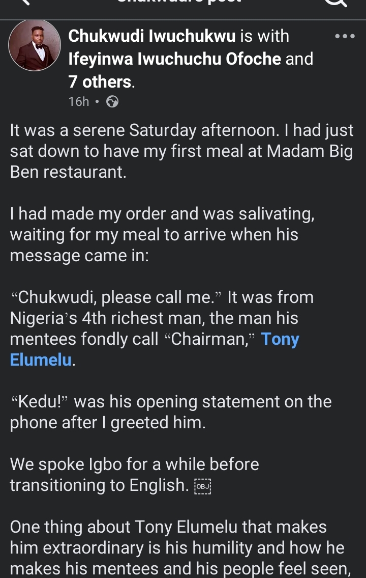 The man identified with the Facebook handle, Chukwudi Iwuchukwu, shared that Tony Elumelu, who recently surprised Charles Okocha, a Nollywood actor, with $50,000, reached out to him via phone call 2 weeks after his mother’s funeral.