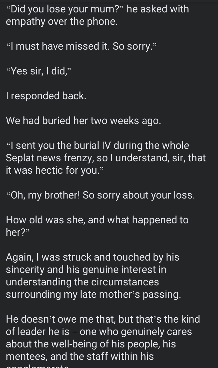 In his post about Tony Elumelu’s personality, he stated, “One thing about Tony Elumelu that makes him extraordinary is his humility and how he makes his mentees and people feel seen, important, and special. He remembers your name, makes you feel at ease, makes you feel that you matter, that you’re important, and a big deal.”