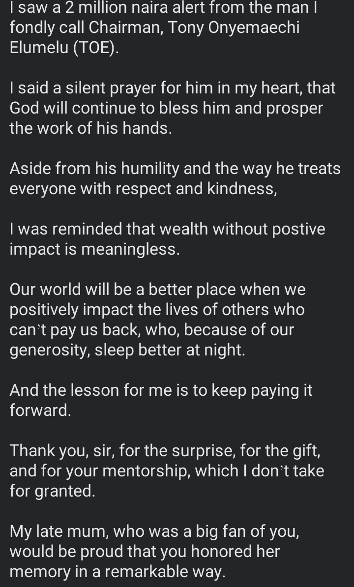 ”I was in the middle of a transit when my phone beeped. I saw a 2 million naira alert from the man I fondly call Chairman, Tony Onyemaechi Elumelu (TOE)”, He stated.