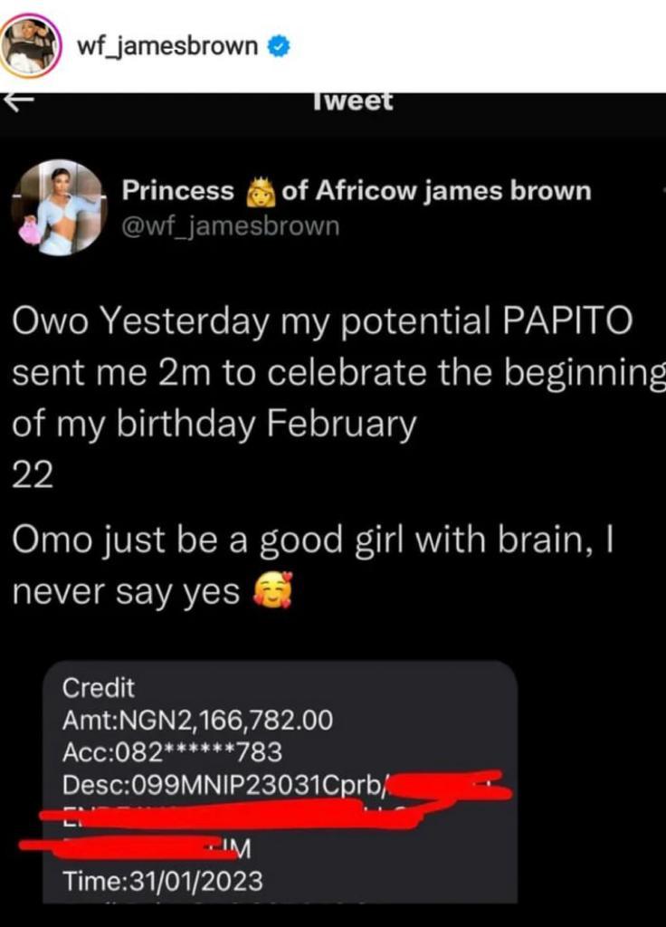 In an attempt to mimic him, James Brown takes to the micro-blogging platform, Twitter. There, he revealed that he got N2 million from a potential ‘papitpo’.