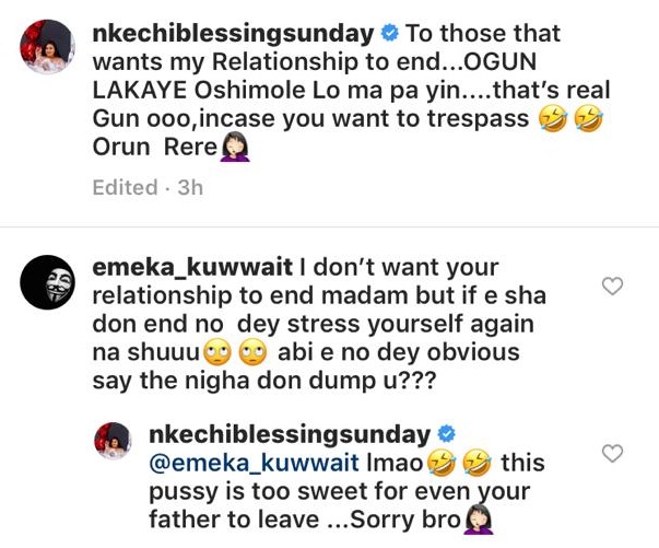 “To those that wants my Relationship to end…OGUN LAKAYE Oshimole Lo ma pa yin….that’s real Gun ooo,incase you want to trespass Orun Rere”