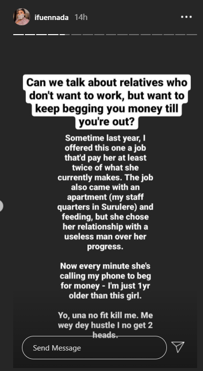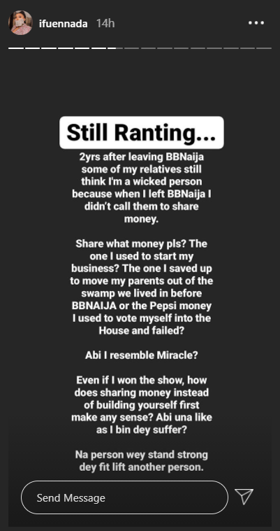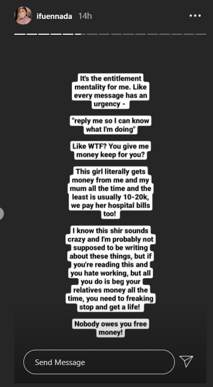 Former big brother Naija housemate, Iheme Faith Uloma, popularly known as Ifu Ennada, has goes on a lengthy rant about entitled relatives on her Instagram page.