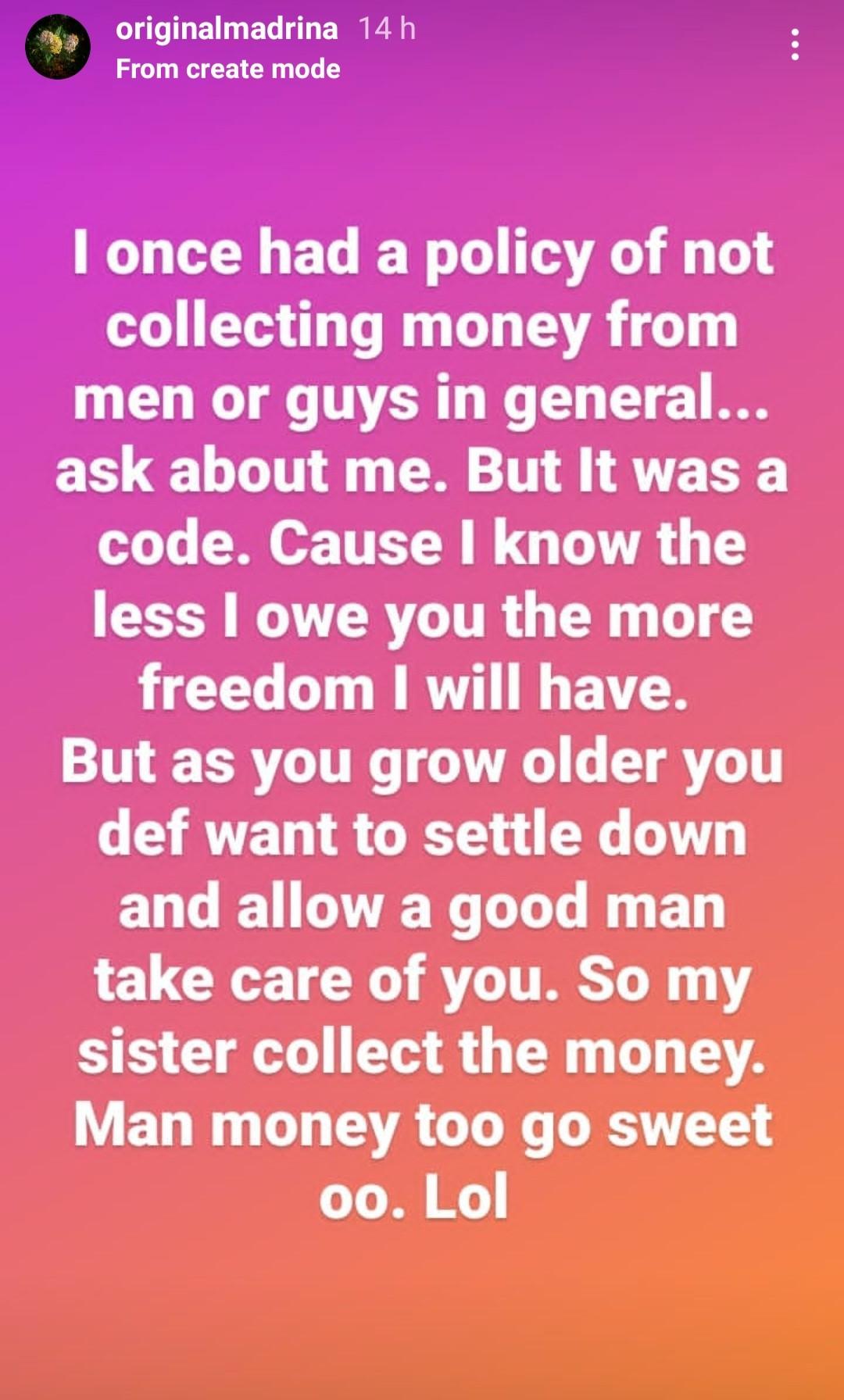 However, in a recent update, Cynthia has taken to her Instastories to disclosed that she used to be like Eniola in the past but added that as “you grow older, you want to settle down and allow a man take care of you.”