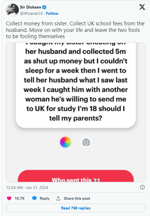 “I caught my sister cheating on her husband and collected 5m as shut up money, but I couldn’t sleep for a week. Then I went to tell her husband what I saw last week; I caught him with another woman. He’s willing to send me to the UK for study. I’m 18; should I tell my parents?”