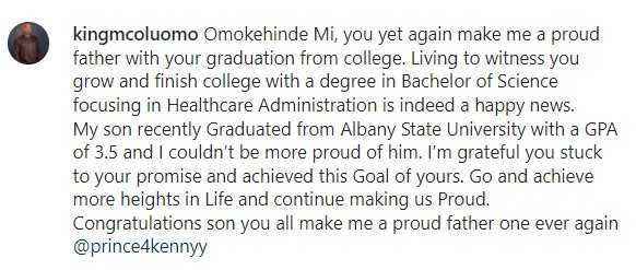 “Omokehinde Mi, you yet again make me a proud father with your graduation from college. Living to witness you grow and finish college with a degree in Bachelor of Science focusing in Healthcare Administration is indeed a happy news.