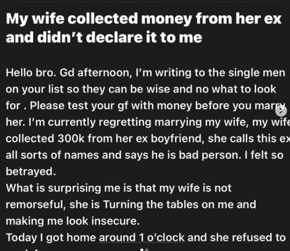An anonymous man has lamented to relationship doctor @Joro how his wife took some cash from her ex-boyfriend without informing him.
