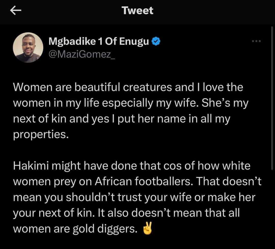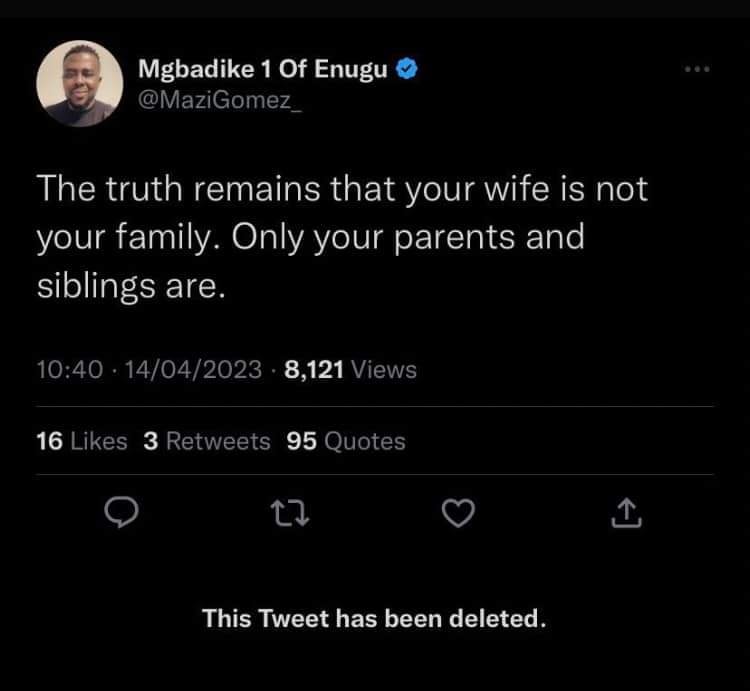 A Twitter user identified as @Mazigomez has made a U-turn after he earlier tweeted that wives are not family members as described.