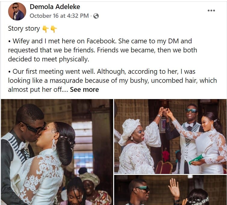 Recounting how they met in the post he shared on Facebook, Demola Adeleke, revealed that his romantic relationship with his wife, Temmy, began after she came to his DM and requested that they become friends.