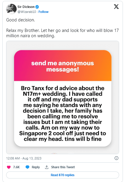 @Wizarab10 said; “She refused to marry of he won’t spend 17 million on her dream wedding. One naira she is not contributing because it is a man’s job to give a woman her dream wedding.”