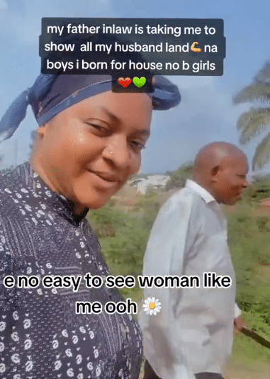 In the video, @trinanicholas can be seen joyfully accompanying her father-in-law as he proudly displayed different parcels of land belonging to her husband.