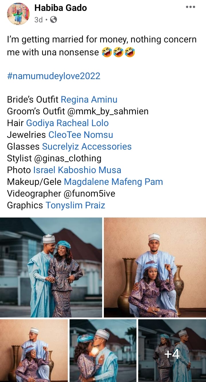 The young woman identified on Facebook as Habiba Gado drew raised eyebrows after she shared pre-wedding photos and stated her motive for marriage.