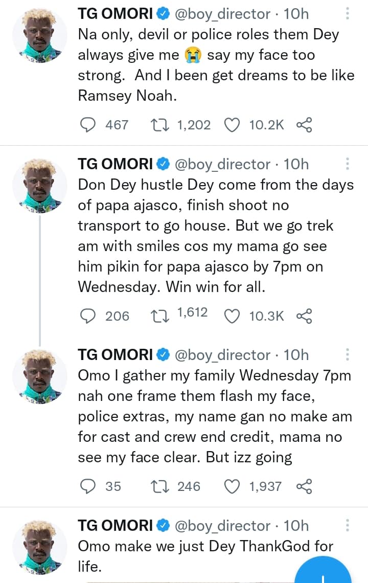 “Don Dey hustle Dey come from the days of papa ajasco, finish shoot no transport to go house. But we go trek am with smiles cos my mama go see him pikin for papa ajasco by 7pm on Wednesday. Win win for all. Omo I gather my family Wednesday 7pm nah one frame them flash my face, police extras, my name gan “no make am for cast and crew end credit, mama no see my face clear. But izz going Na only, devil or police roles them Dey always give me say my face too , strong. And I been get dreams to be t like Ramsey Noah.”