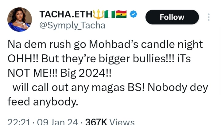 “Na dem rush go Mohbad’s candle night OHH!! But they’re bigger bullies!!! iTs NOT ME!!! Big 2024!!