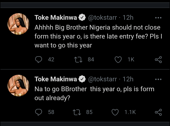 In another post, Toke wrote, “Ahhhh Big Brother Nigeria should not close form this year o, is there late entry fee? Pls I want to go this year.”