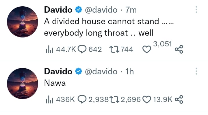 In a short tweet shared via his official account, Davido expressed his disapproval over the situation while noting that a divided house cannot stand.