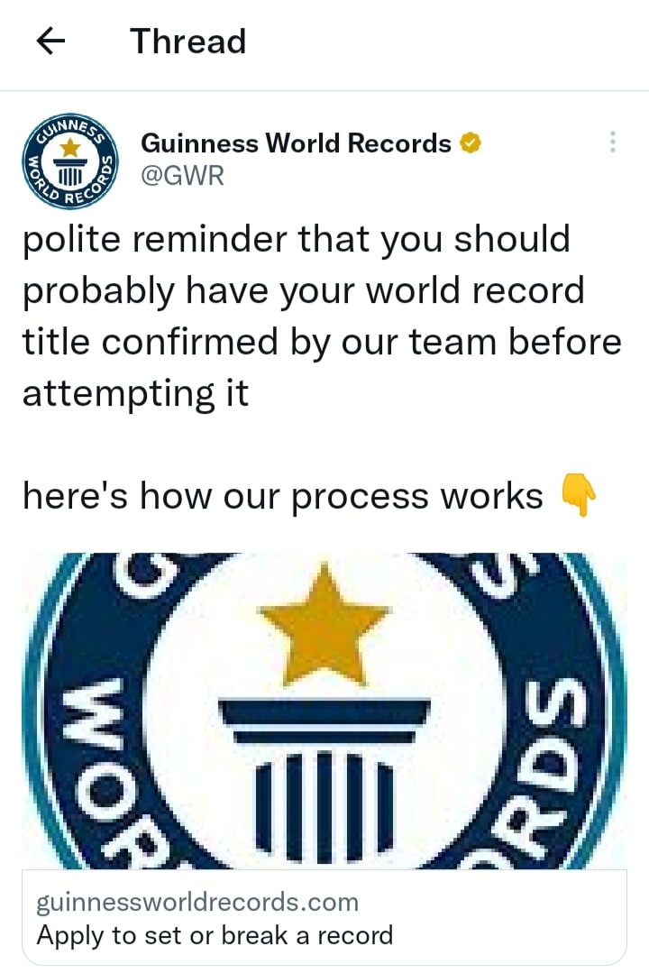 “Polite reminder that you should probably have your world record title confirmed by our team before attempting it”, Guinness wrote.