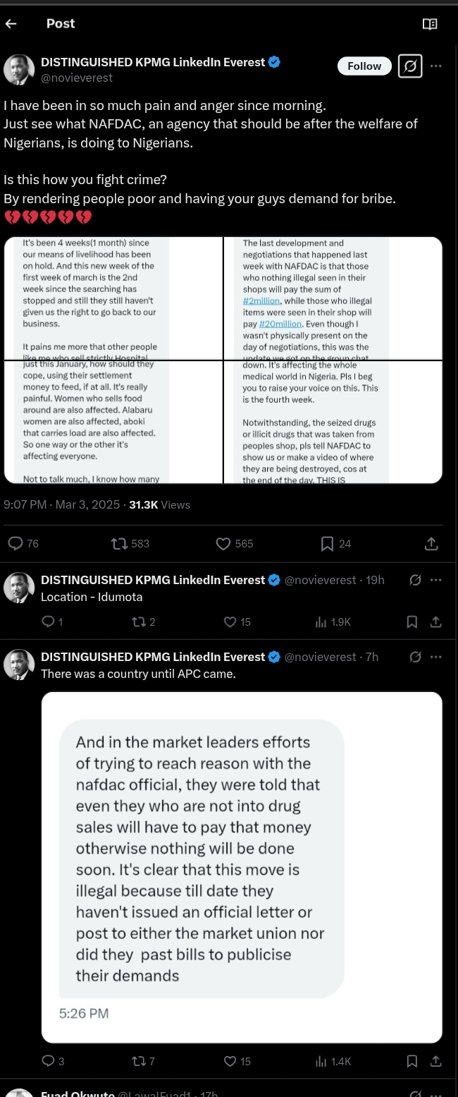 A post currently trending on popular social media platform X (formerly Twitter) has raised serious allegations against officials of the National Agency for Food and Drug Administration and Control, NAFDAC over the closure of pharmacies.