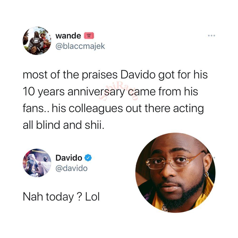 Nah Today – Davido reacts to his colleagues failing to celebrate his 10th Anniversary