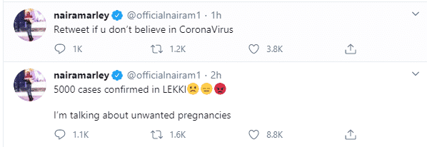 The controversial singer also went ahead to joke about ‘5,000 cases of confirmed unwanted pregnancies’ in Lekki area of Lagos State.