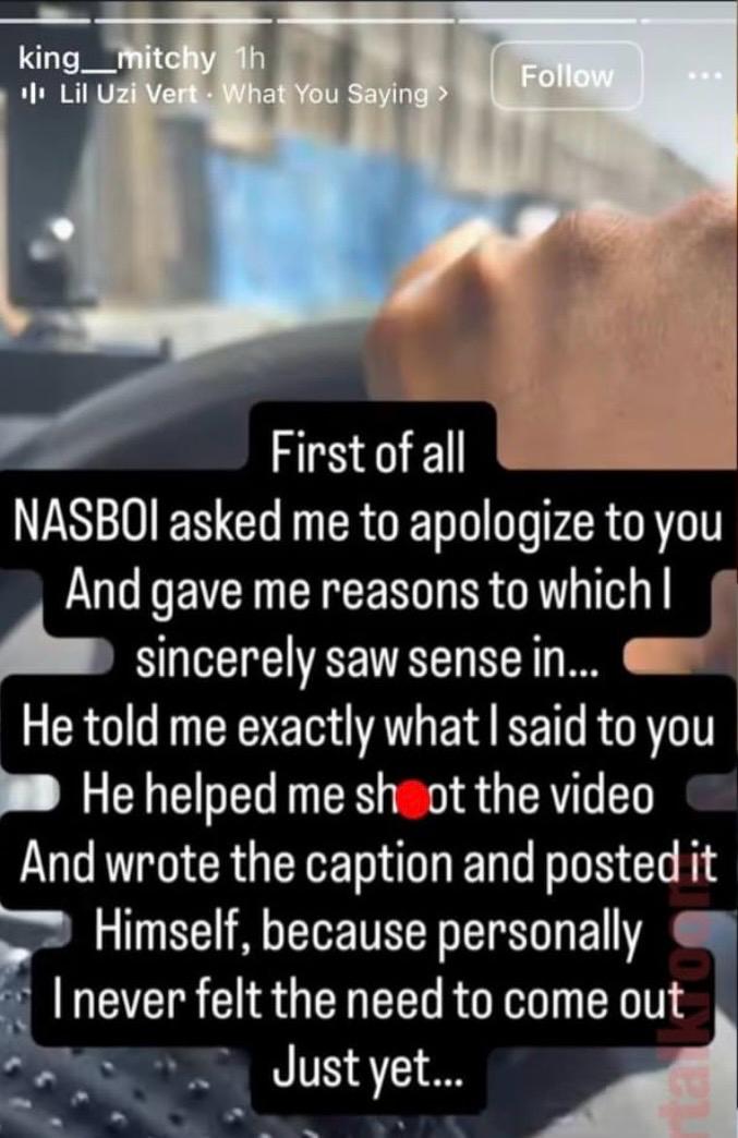 “It was Nasboi that asked me to apologise to you. I never felt the need to come out. He told me what to say to you, he shot the video, posted it, and wrote the caption.”