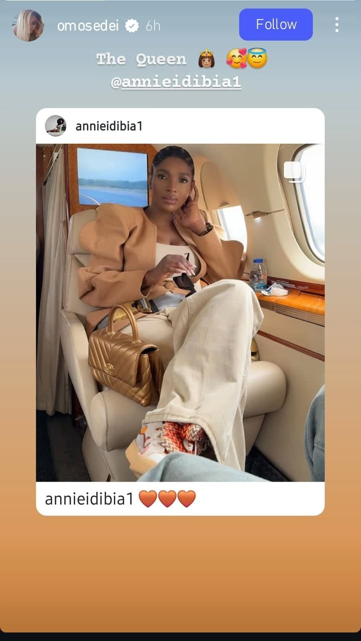 Reacting to the public appearance of the estranged wife of 2Baba now the lover of her niece, Natasha Osawaru, Gabriella Ogbinedion posted Annie’s photos on her Instagram story and referred to Annie as a queen.