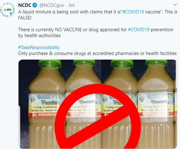 In a tweet posted on its handle this morning, NCDC warned against consuming any of such mixtures, adding that there is currently no vaccine or drug approved for COVID19 prevention.