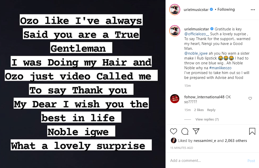 According to Uriel, she was making her hair when Ozo called to thank her for supporting him. She also described him as a gentleman, saying Nengi has a good man.