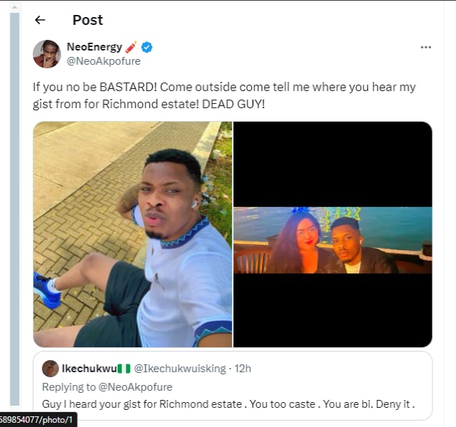 In response, Neo replied to the troll, “If you no be BASTARD! Come outside come tell me where you hear my gist from for Richmond estate! DEAD GUY!