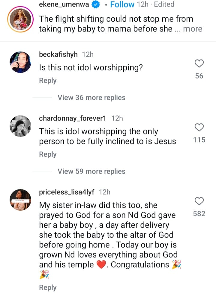 Trolls slam actress Ekene Umenwa as they accuse her of idol worshipping following video of her dedicating her baby to Mother Mary.