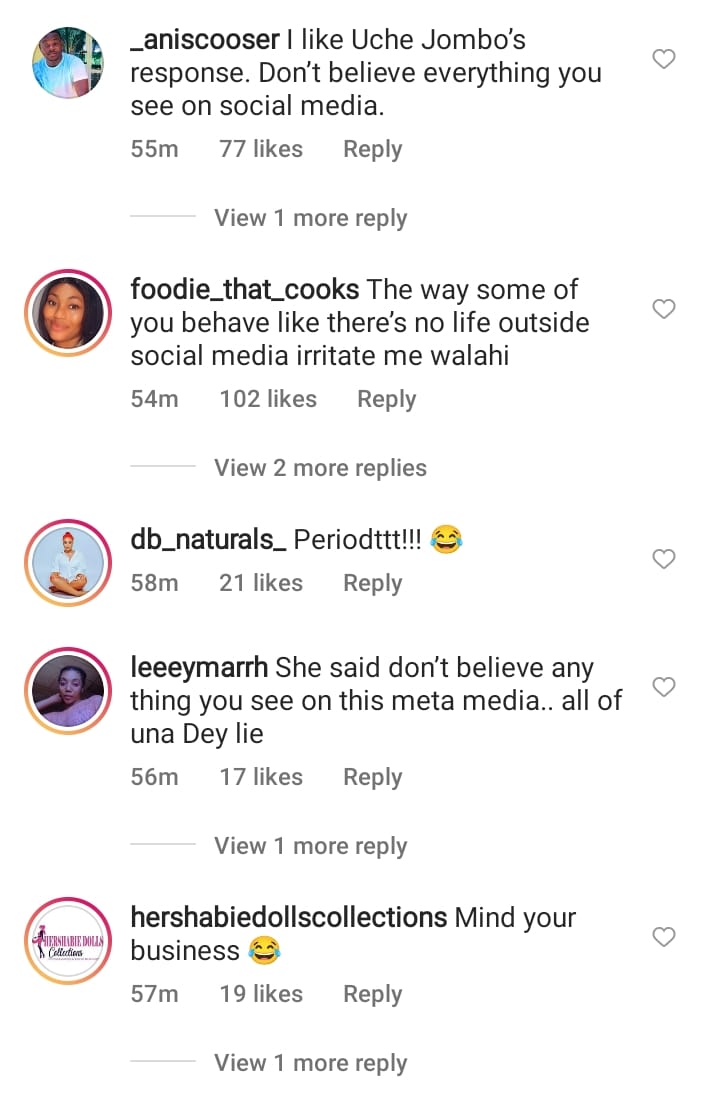 Replying to this, Uche Jombo has asked the fan how about he doesn’t believe everything he sees on social media.