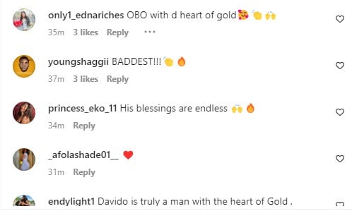 “Davido is truly a man with the heart of Gold , Bronze and Diamond. Only one OBO. We love you🙌🙌🙌🙌,” a fan wrote.