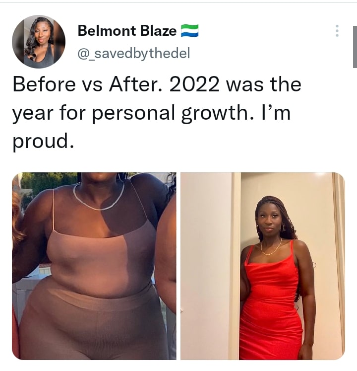 The Sierra Leonean lady who goes by the name Belmont Blaze on Twitter took to the micro blogging platform to share a photo of her from a year ago when she was still corpulent.