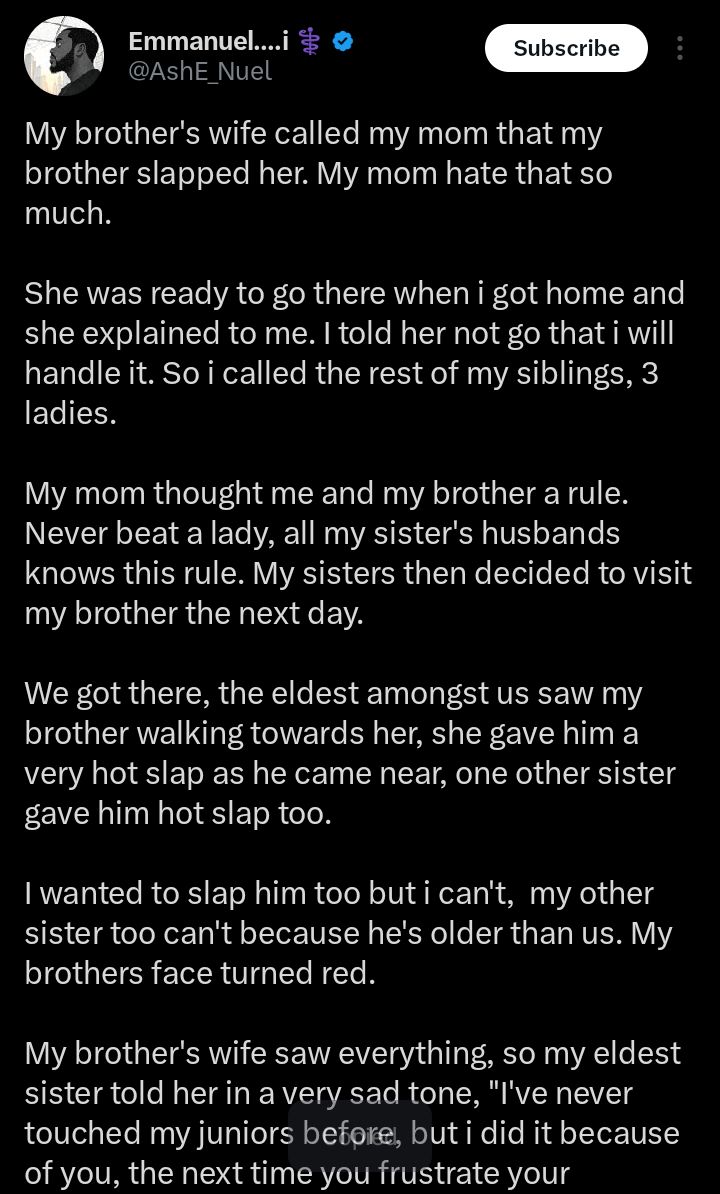During the visit, tensions escalated when two of the sisters reportedly slapped their brother in response. “As he walked towards us, my eldest sister gave him a very hot slap… another sister did the same,” the narrator recounted.
