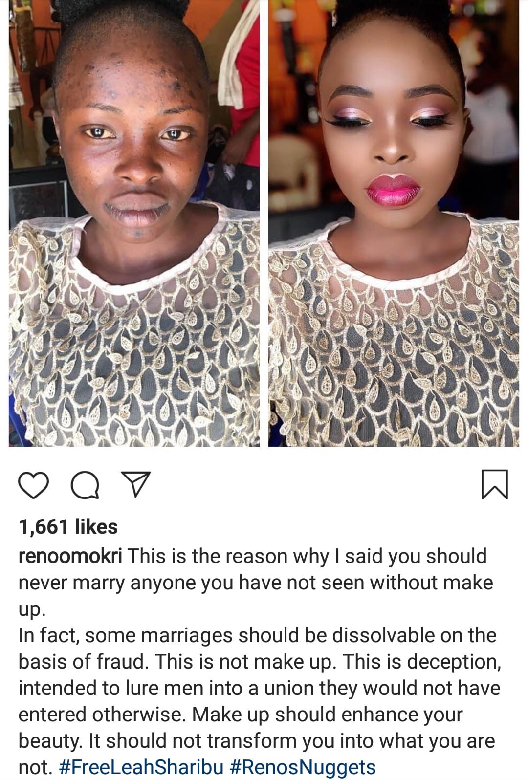 “This is why I say never marry anyone you have not seen without makeup! In fact, some marriages should be dissolvable on the basis of fraud. This isn’t makeup. This is deception, intended to lure men into a union they’d not have entered otherwise.”