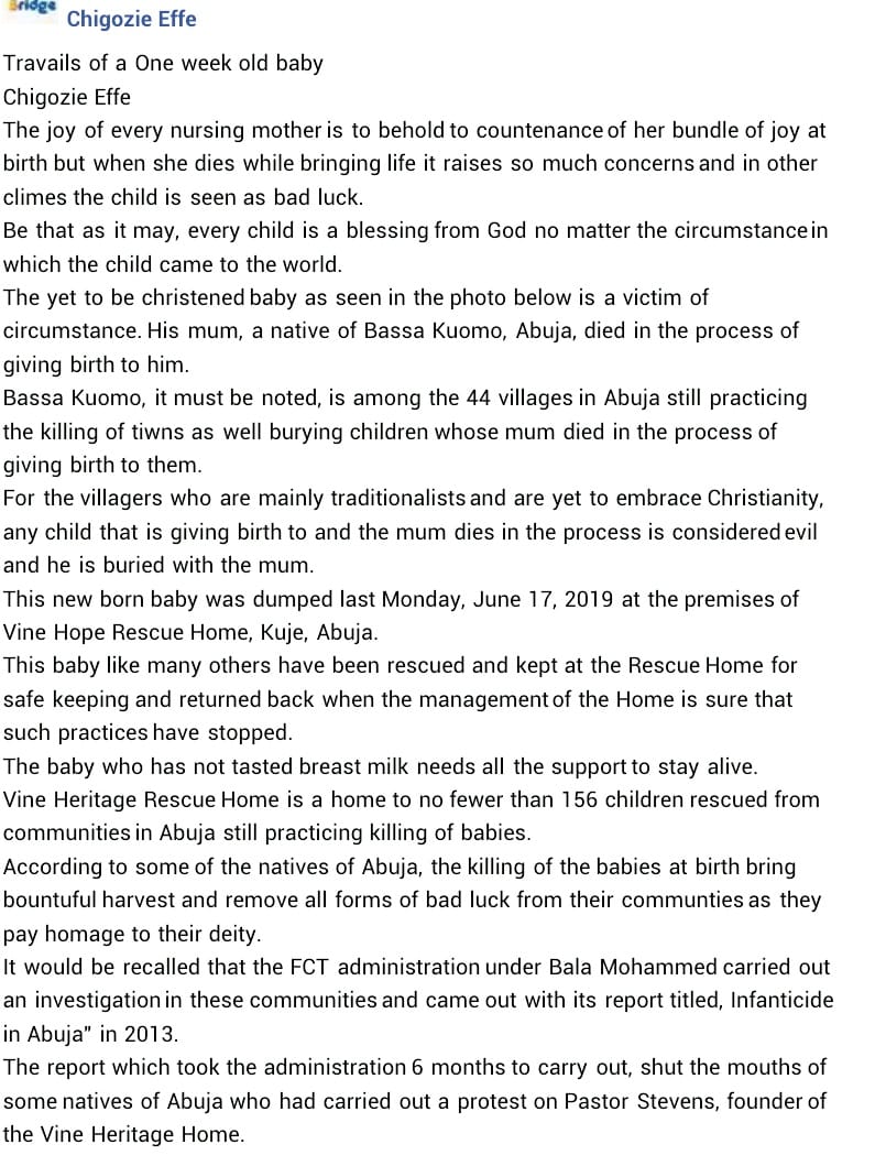 According to Facebook user, Chigozie Effe, mother of the bady boy died while giving birth to him. The late mother was a native of Bassa Kuomo, one of the villages in Abuja, which allegedly still practices the killing of twins as well burying children whose mother died in the process of giving birth to them.