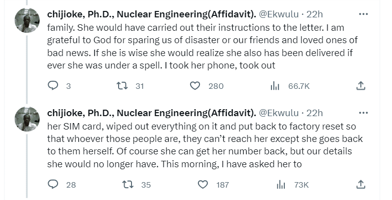 The Twitter user with the handle @Ekwulu shared this harrowing tale, recounting the events that unfolded within their household.