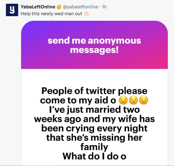 “People of twitter please come to my aid o I’ve just married two weeks ago and my wife has been crying every night that she’s missing her family What do I do o”