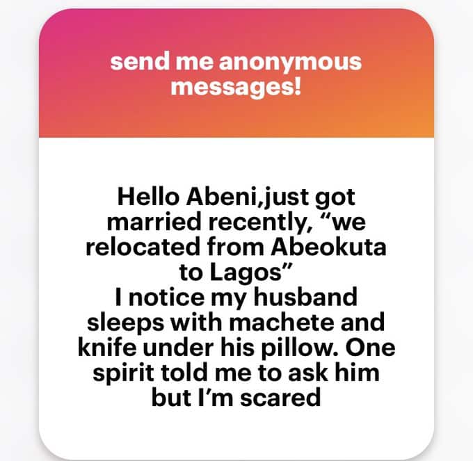 “Hello Abeni just got married recently. We relocated from Abeokuta to Lagos. I noticed my husband sleeps with machete and knife under his pillow. One spirit told me to ask him but I’m scared.”