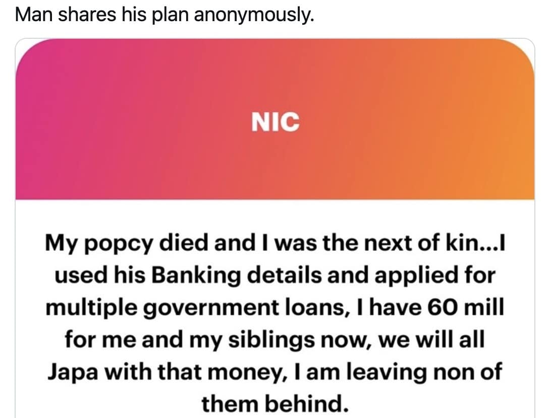 “My popcy died and I was the next of kin…I used his banking details and applied for multiple government loans. I have 60 mill for me and my siblings now, we will all japa with that money, I am leaving none of them behind.”