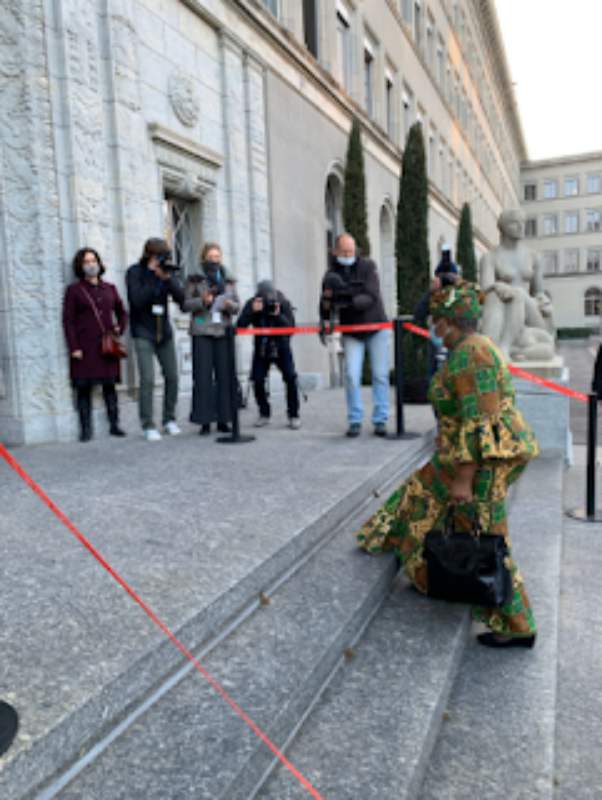 In her first appearance to work at the World Trade Organisation, Okonjo rocked a native Ankara outfit as always in her well-styled head tie ‘gele’ and a handbag. She made quite an entrance as she poses for press-photographers.