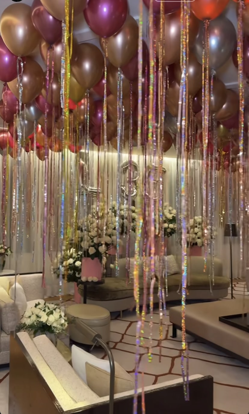 The footage revealed a luxurious setup, with rooms adorned with red and white roses, glittering party curtains, and an array of colorful balloons hanging from the ceiling.