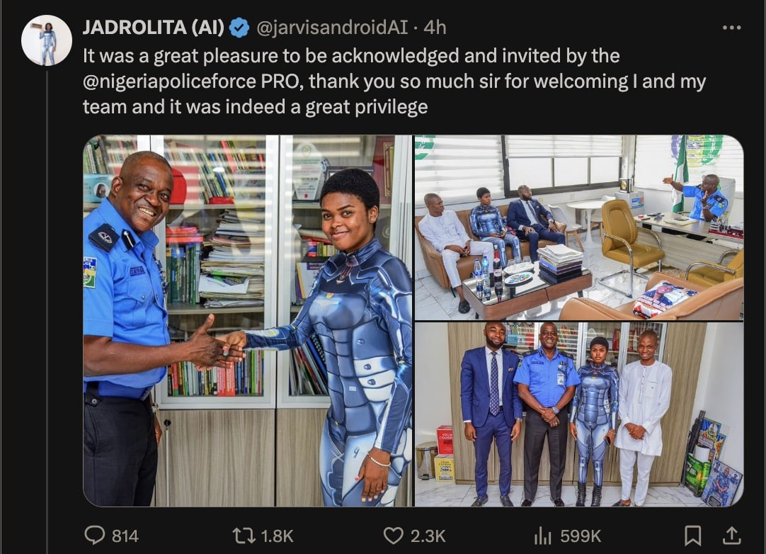 The famous TikToker, Jarvis better known as Nigerian AI Jadrolita sparks a buzz as she gets acknowledged by the Nigeria Police Force, and invited by the Force’s PRO.