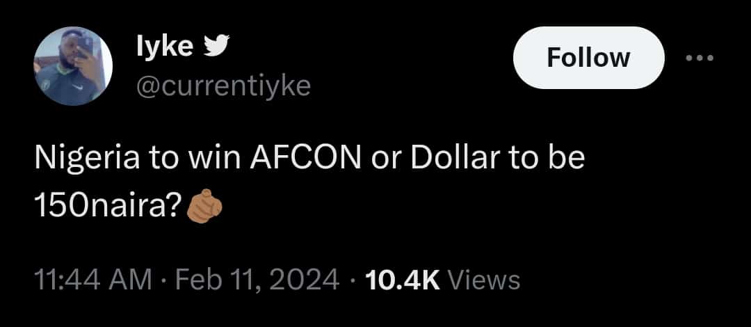 “Nigeria to win AFCON or 1$ to be ₦150?” – Man asks Nigerians to choose AFCON win or 1 Dollar to be ₦150