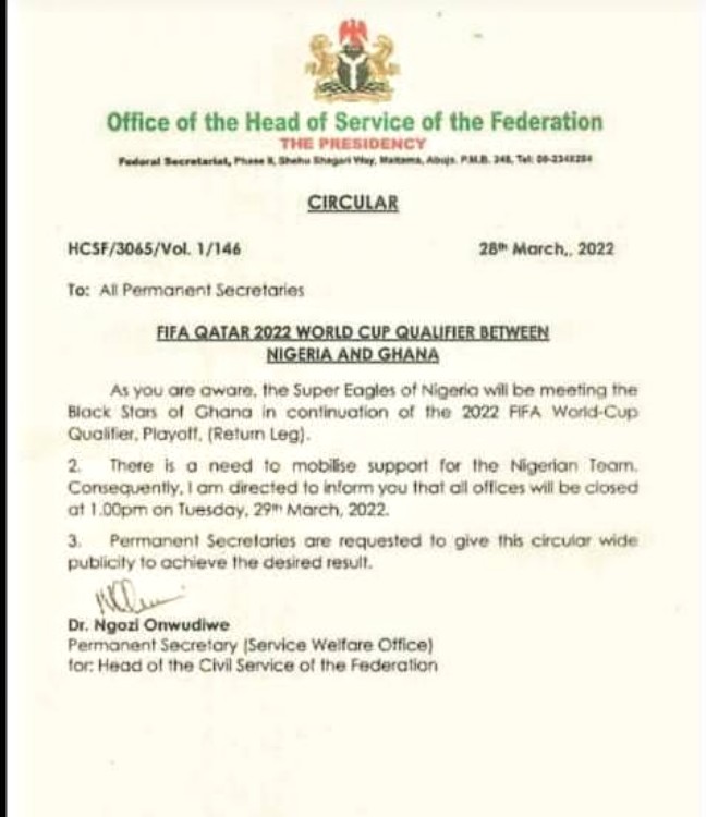 “There is a need to mobilise support for the Nigerian Team. Consequently, I am directed to inform you that all offices will be closed at 1.00 pm on Tuesday, 29th March 2022.