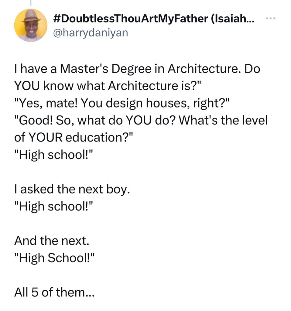 He answered affirmatively that he could read and went ahead to tell them that he’s also an architect with a master’s degree.