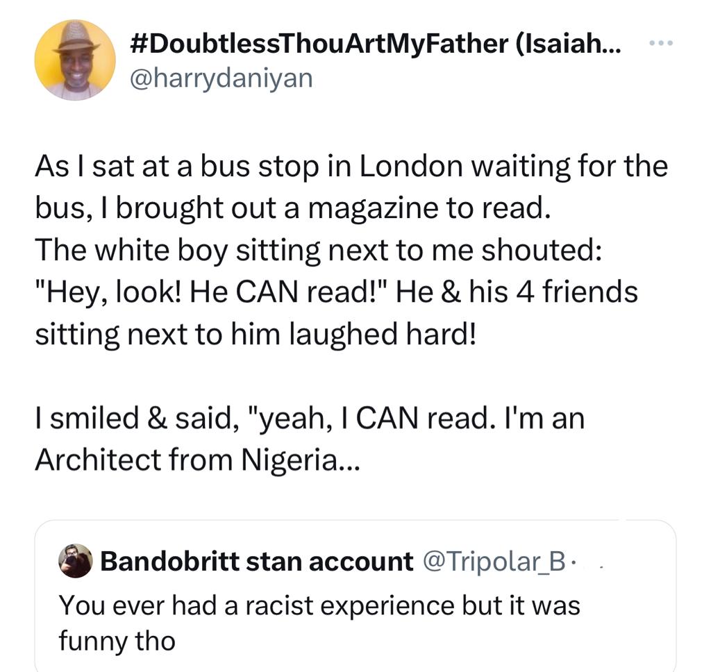 The Nigerian man identified as @harrydaniyan narrated that while he was at a bus stop in London, he had brought out a magazine to read when some caucasian boys remarked with surprise that he could read.