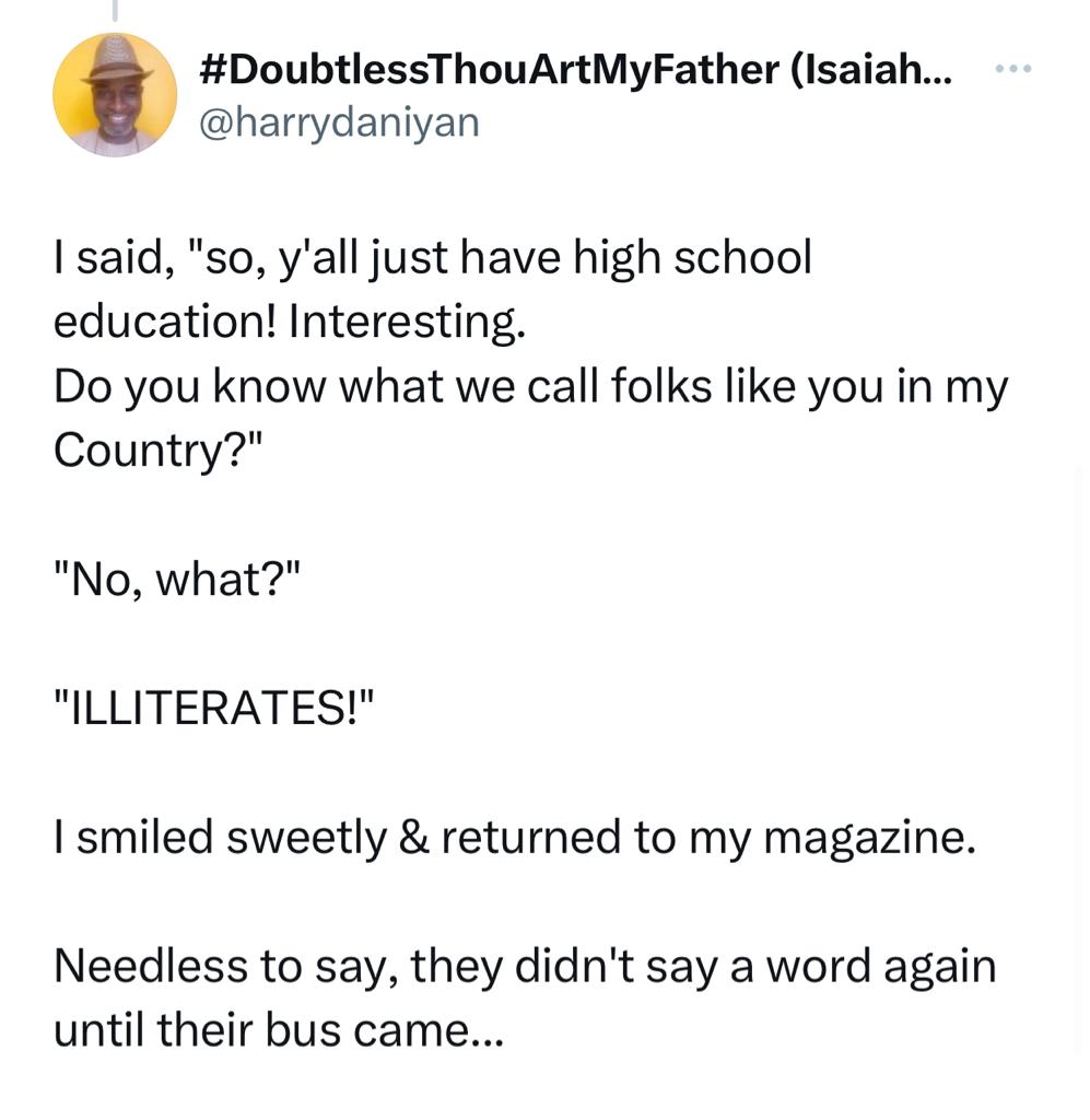 The Nigerian man then told them that what they call people with only that level of education from Nigeria, where he comes from, are ‘illiterates’.