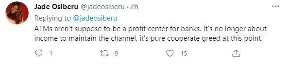 “Nigerian Banks and their fraudulent behavior. ATMs have a capacity of N20k per withdrawal but you limit to N10k so you can charge N35 per withdrawal, on a platform that’s suppose to be a low cut option for servicing your customers. Why is